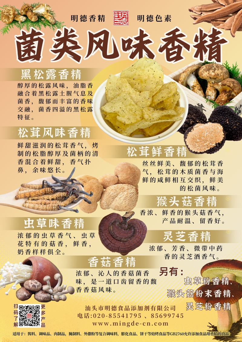 汕頭市明德食品添加劑有限公司的菌類風(fēng)味香精系列,涵蓋黑松露、松茸、蟲草、猴頭菇、靈芝、香菇等多種風(fēng)味,并配有粉末型產(chǎn)品。產(chǎn)品菌香真實(shí)、留香持久、層次豐富,適用于湯料包、醬料、調(diào)味品、肉制品、腌制料及外撒粉、復(fù)合調(diào)味料,膨化食品、餅干等焙烤食品等B端應(yīng)用,幫助工廠打造具有辨識(shí)度的菌類風(fēng)味產(chǎn)品。