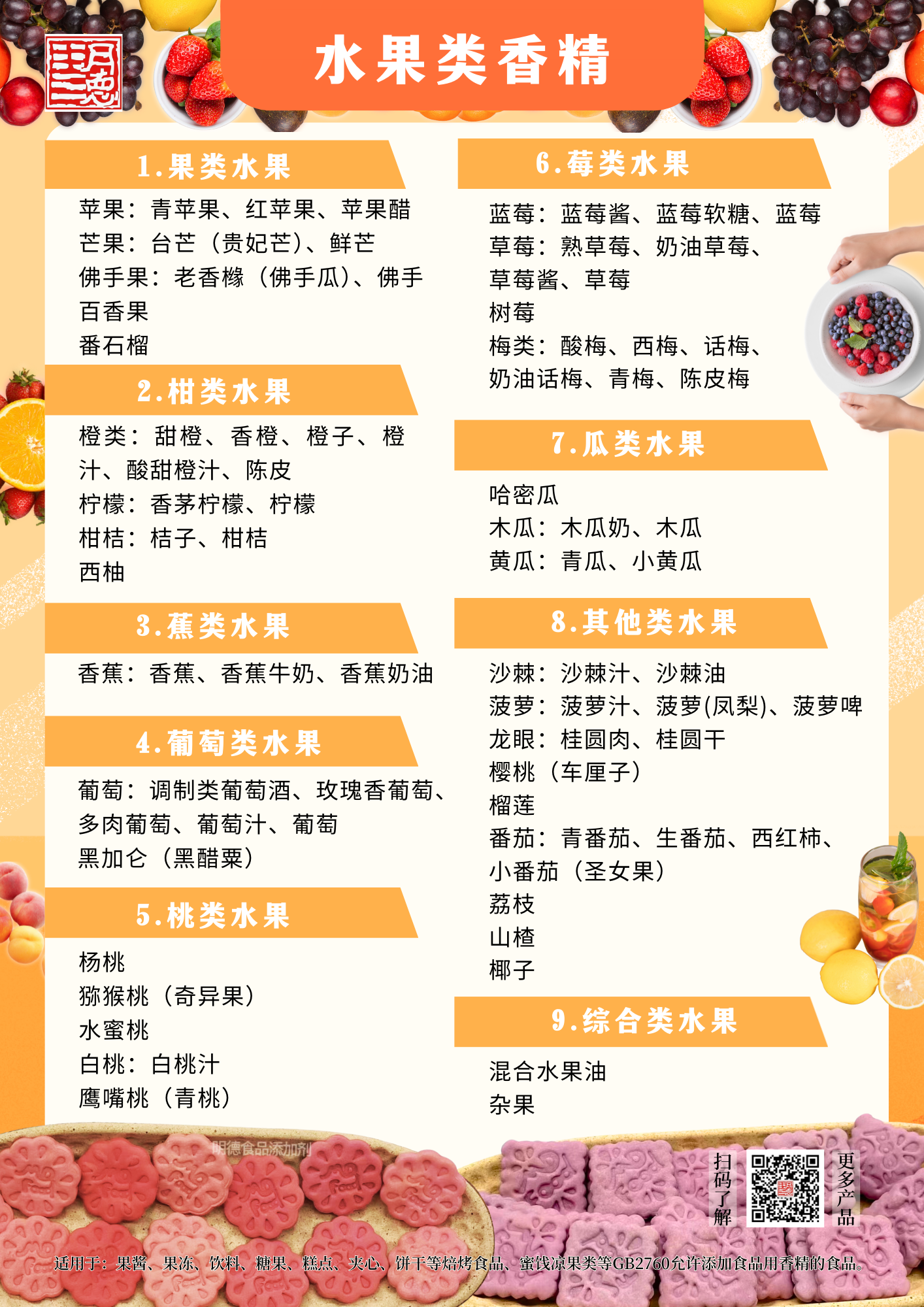此外,明德香精還可提供各類水果類香精,包括蘋果、芒果、柑橘、香蕉、葡萄等各類水果風味,可廣泛應用于糖果、飲料、功能性食品、零食、方便食品、烘焙等領域。