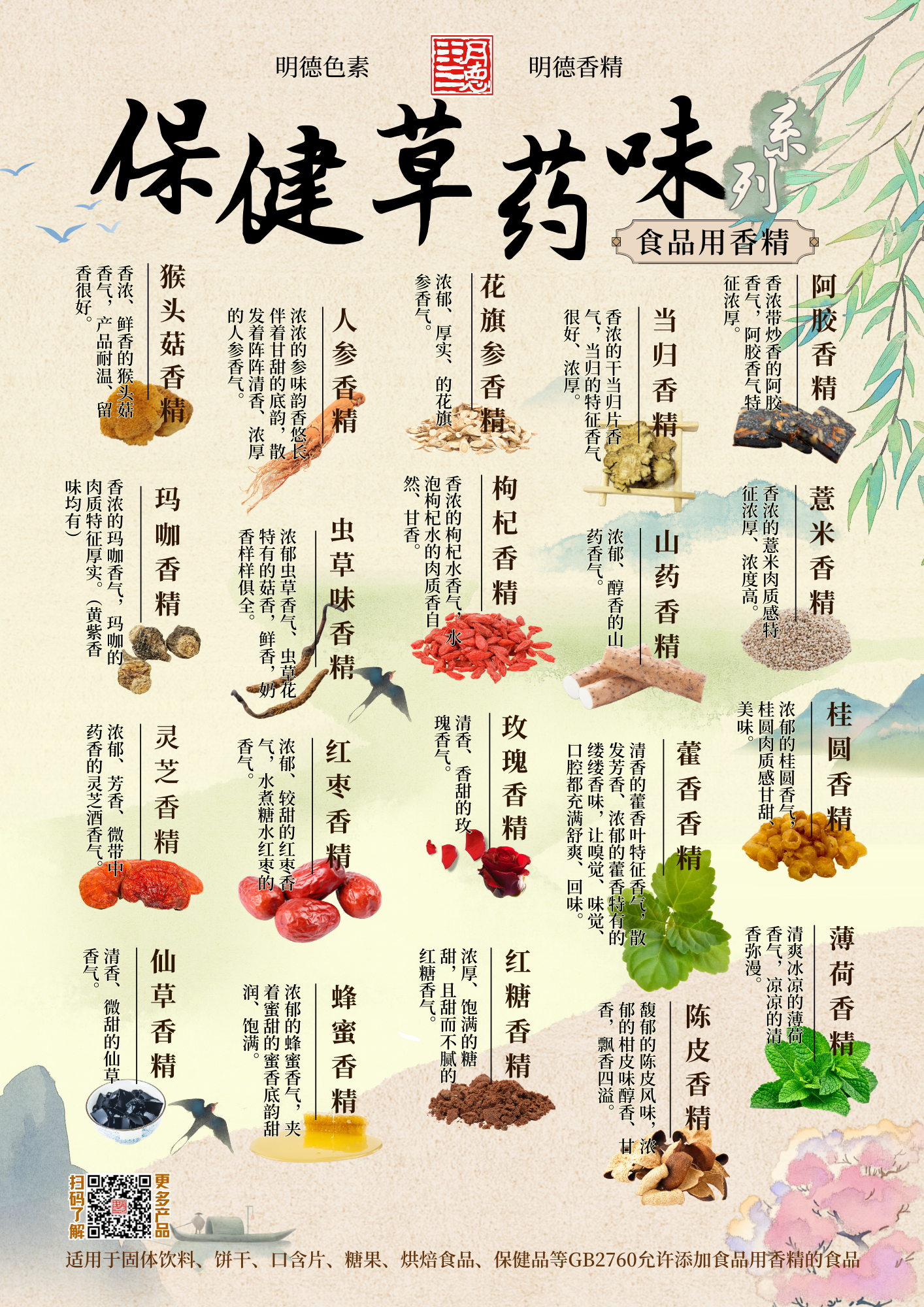 明德香精擁有20余種草藥風味可供選擇,如人參的草本清香和甘甜底味、山藥的醇香清潤、枸杞泡水后散發(fā)的清甜果香、當歸的溫暖辛甘......各類藥草香精風味特征鮮明,香味厚實濃郁,適用于固體飲料、餅干、口含片、糖果、烘焙食品、保健品等產品。