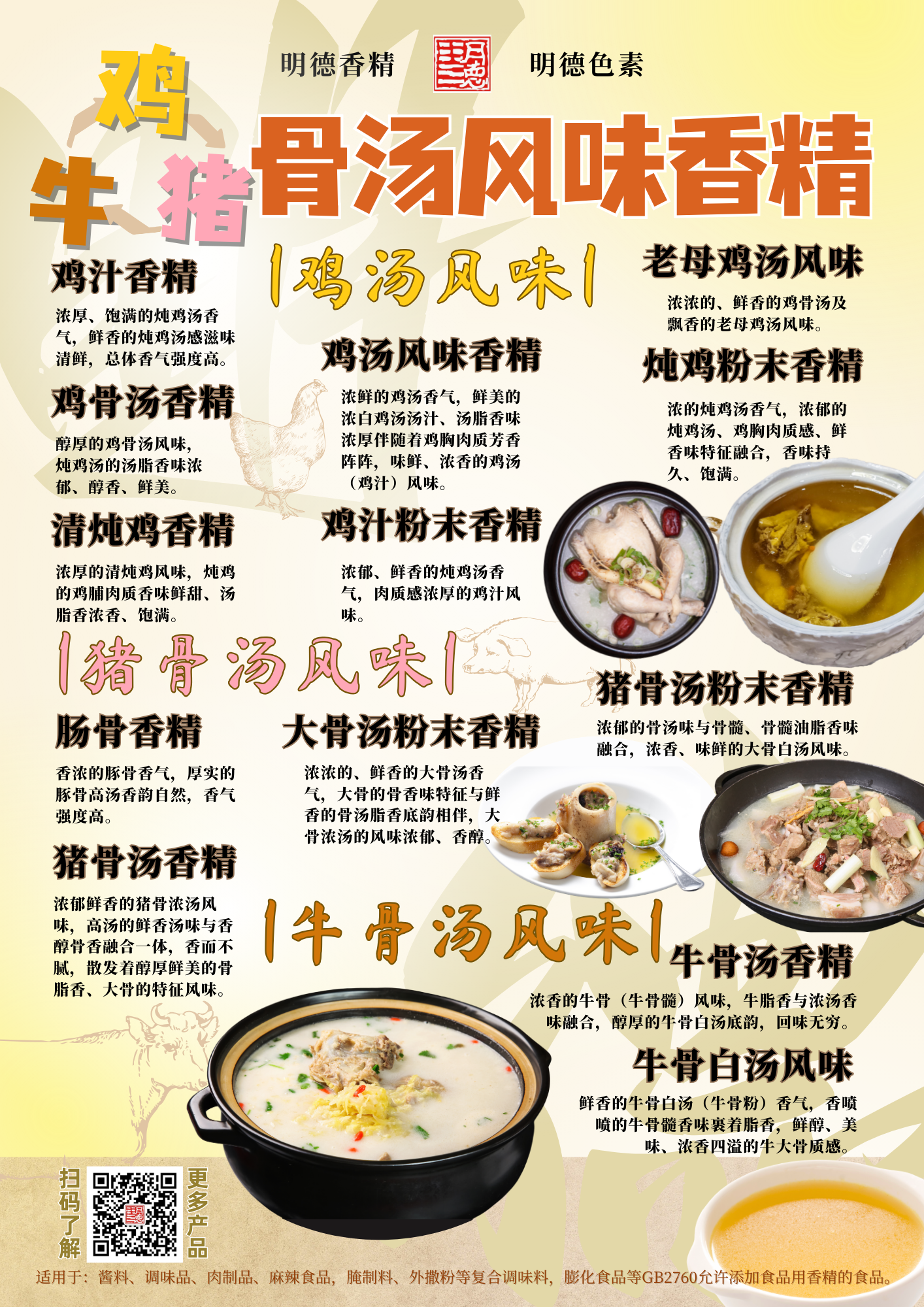 骨湯風味是動物骨骼熬煮后產生的獨特鮮美滋味,融合了骨香、肉香、脂香與氨基酸分解產生的鮮味特征。明德香精開發(fā)了多種雞湯、豬骨湯、牛骨湯風味香精,適用于醬料、調味品、肉制品、麻辣食品,腌制料、外撒粉等復合調味料,以及膨化零食等產品,可賦予產品濃郁、醇厚的口感。
