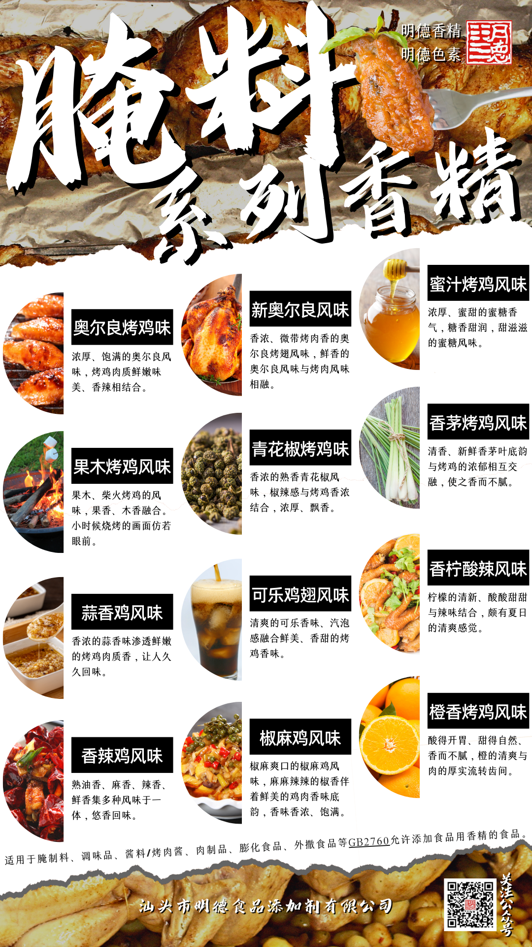 明德食品開發(fā)出了種類豐富的腌料香精,風味來源于經典菜品,如奧爾良烤雞、香茅烤雞、果木烤雞、椒麻雞等,可提升產品質感和風味。