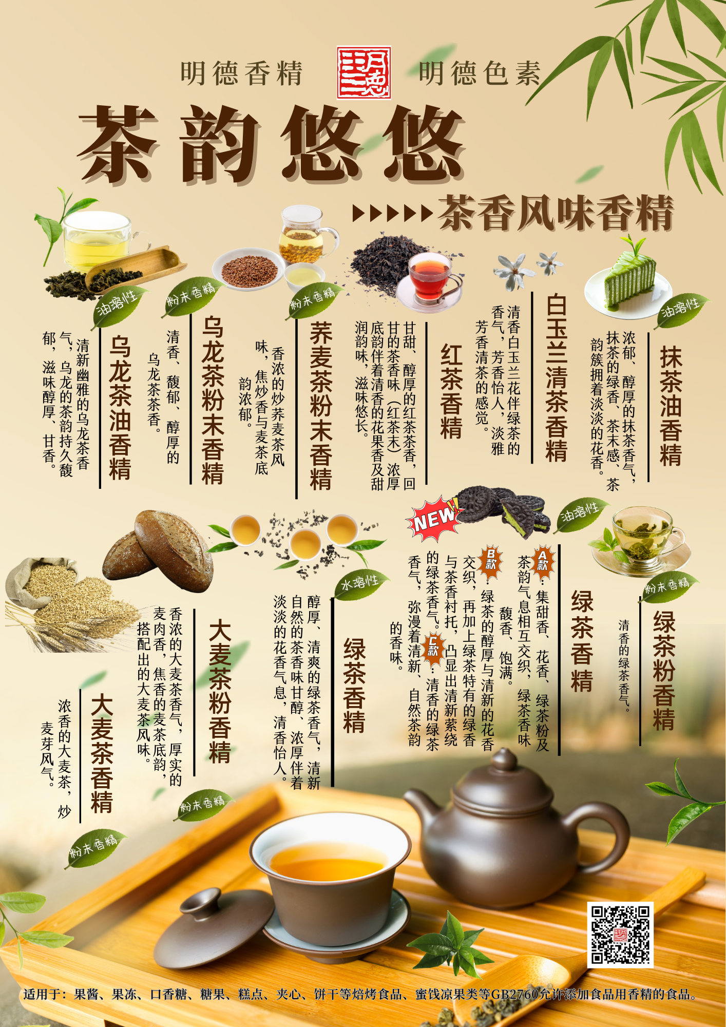 在產品類型上,明德香精可提供油溶性、水溶性、粉末香精等多種香精類型,能夠滿足果醬、果凍、口香糖、糖果、糕點、夾心餅干等焙烤食品,以及蜜餞涼果零食等產品對茶香風味的需求。